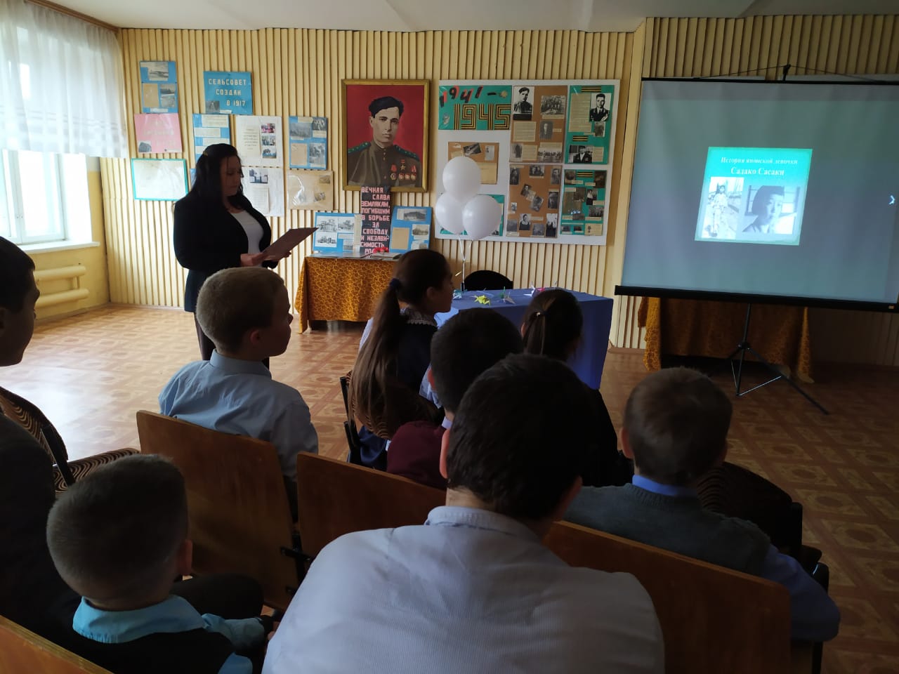 Учащихся познакомили с историей о японской девочке Садако Сасаки, которая попала под ядерный взрыв над Херосимой в 1945 году. История этой девочки, которая мужественно боролась за жизнь, стала легендой. Для учащихся была продемонстрирована презентация, в которой рассказывалось о памятниках с журавлями.