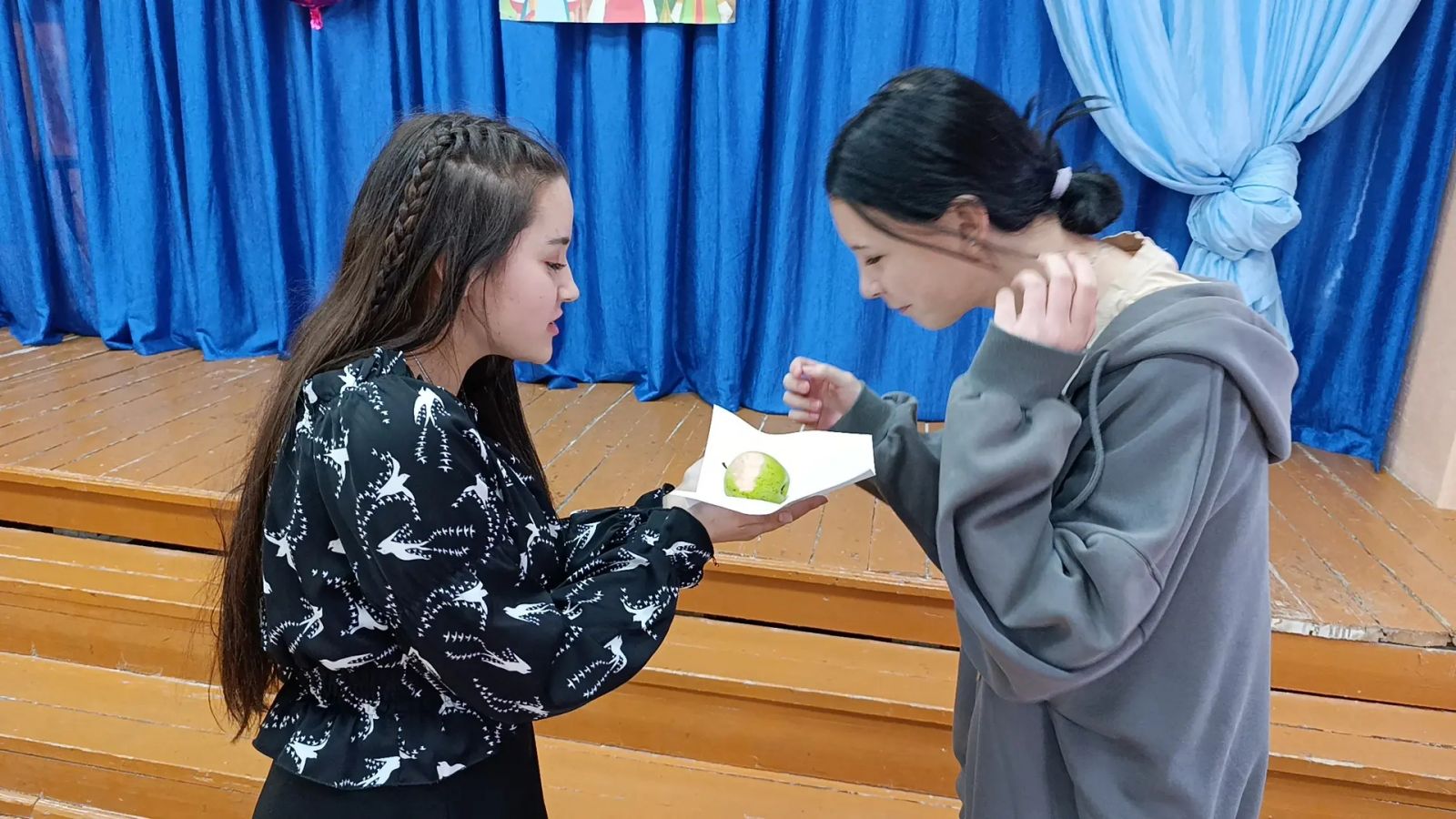 Кульминацией праздника стал забавный конкурс на скорость поедания яблок. Однако задача оказалась не из легких — девушкам нужно было справиться с угощением, не используя руки. Это вызвало море смеха и искренних эмоций у всех присутствующих, подарив заряд отличного настроения.