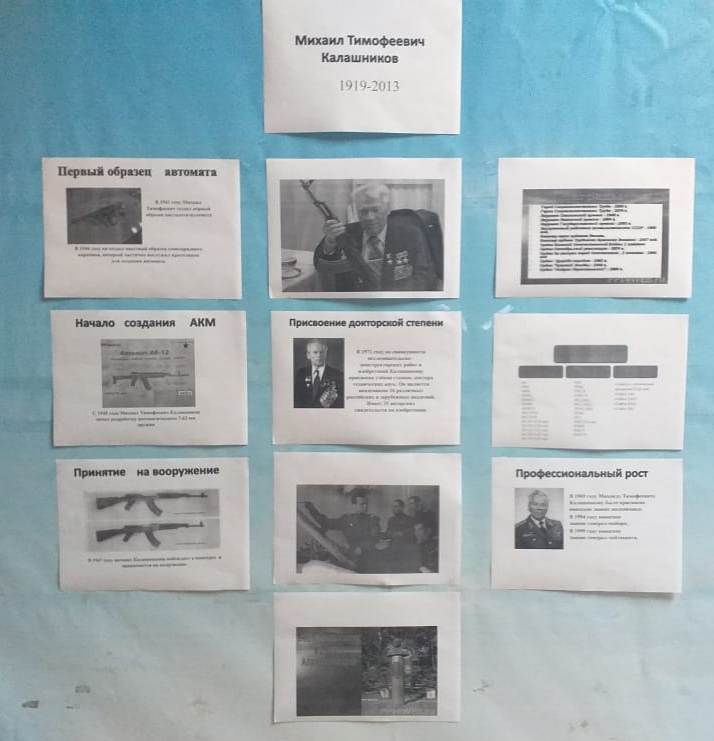 10 ноября в нашей школе был оформлен информационный стенд, посвященный конструктору с мировым именем - Михаилу Калашникову. Михаил Тимофеевич Калашников родился 10 ноября 1919 года в селе Курья Алтайской губернии. Генерал-лейтенант и доктор технических наук Калашников имел 35 авторских свидетельств на изобретения и являлся академиком 16 различных российских и зарубежных академий. Он - Почетный гражданин Ижевска, Удмуртии, Алтайского края и села Курья, был Депутатом Верховного Совета СССР нескольких созывов. Лауреат многих государственных премий, Герой России, Калашников был награжден многими советскими и российскими орденами и медалями, а также государственными наградами других стран. https://www.calend.ru/persons/6150/