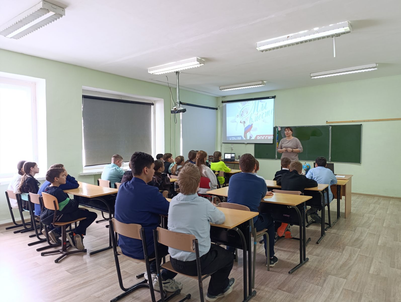Для обучающихся 5-6 классов была проведен игра - викторина «Мы вместе: Крым и Россия». В процессе игры ребята узнали о месте расположения и истории возникновения достопримечательностей, о том какие города расположены на полуострове Крым, о столице Крыма, городе Севастополь. Были показаны памятники культуры, красивейшие места планеты с изображениями знаменитых мест Крыма.