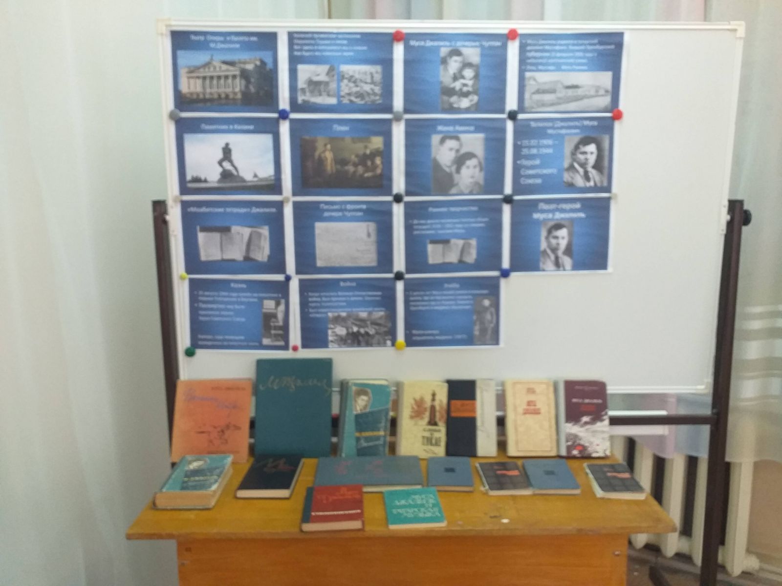 Опубликовано: 15.02.202215 февраля учителем родного языка Якуповой Г.М. и библиотекарем Шилкиной Н.В. был оформлен информационный стенд и библиотечная выставка, посвященная Герою Советского союза поэту-патриоту Мусе Джалилю.