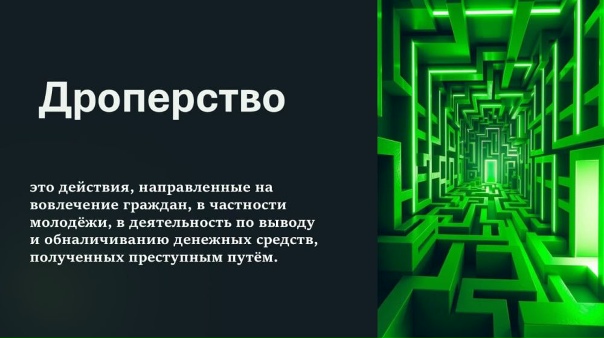 Далее была затронута тема нового вида преступлений – дропперство. Дропер – это человек, который участвует в нелегальных схемах по выводу средств с банковских карт. Он оформляет на себя банковскую карту (дроп-карту), через которую мошенники переводят и обналичивают украденные средства.