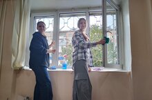 Девочки помыли окна в кабинетах здания Совета ветеранов. -