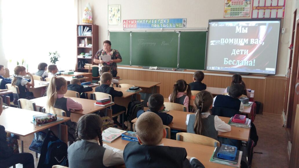 3.09.16 в нашей школе прошли мероприятия, посвященные Дню солидарности в борьбе с терроризмом: Во всех классах прошли классные часы на тему "Терроризм. Беслан", посвященный 12 годовщине трагедии в школе №1 г.Беслана. Были организованы конкурсы рисунков, показаны презентации. В старших классах прошли "Веселые старты". В среднем звене нашей школы, перед учащимися выступила Шарифуллина А.Р. , педагог-организатор ОБЖ, она рассказала им об истории возникновения терроризма, о самых массовых и известных террористических актах современности, о том, как и чем опасно это явление.