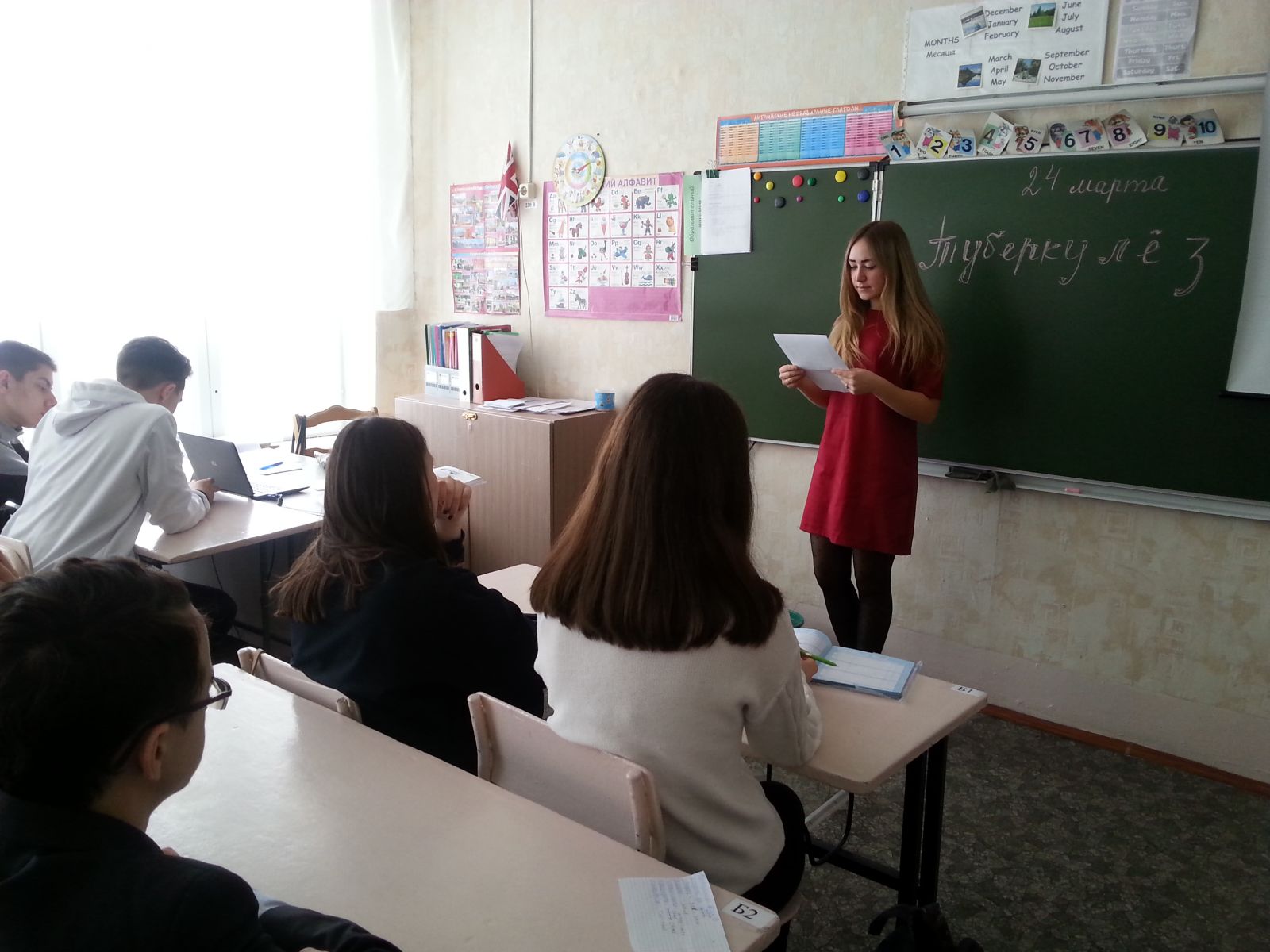Опубликовано: 28.03.2018Классный час на тему «Туберкулёз» был проведен в 10А классе самими ребятами. Они дали определение туберкулезу, рассказали о причинах возникновения туберкулёза, о влиянии туберкулёза на организм человека. А также познакомили с профилактическими мерами.
