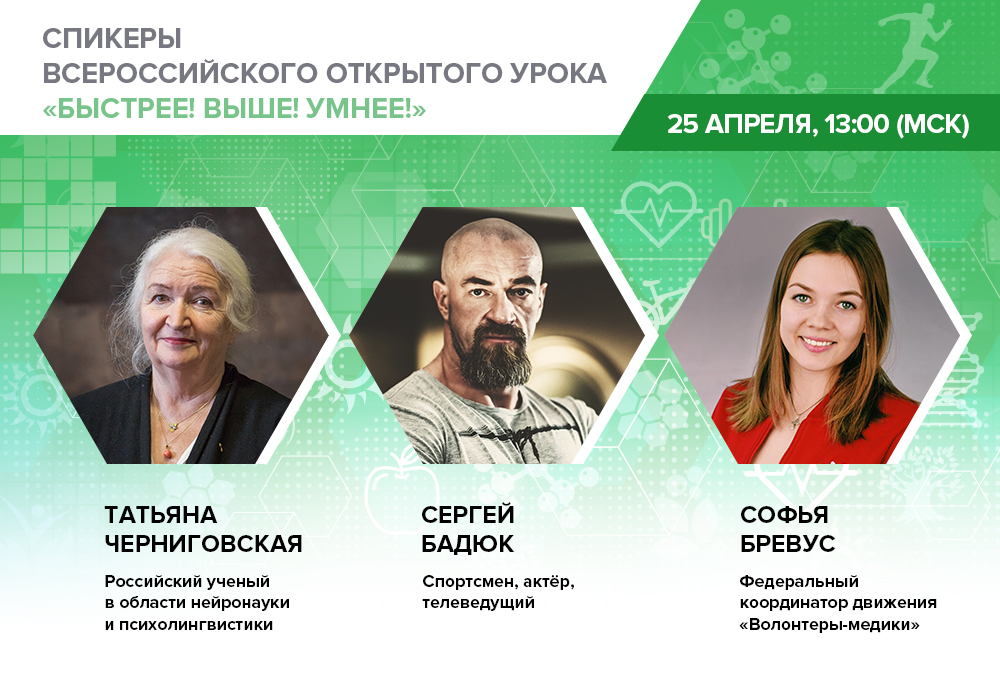 Опубликовано: 25.04.201925 апреля учащиеся 10 класса приняли участие во Всероссийском открытом уроке «ПроеКТОрия». Тема урока «БЫСТРЕЕ! ВЫШЕ! УМНЕЕ!». Эксперты рассказали, как сон и тренировки влияют на самочувствие и какие специалисты помогают нам придерживаться здорового образа жизни.