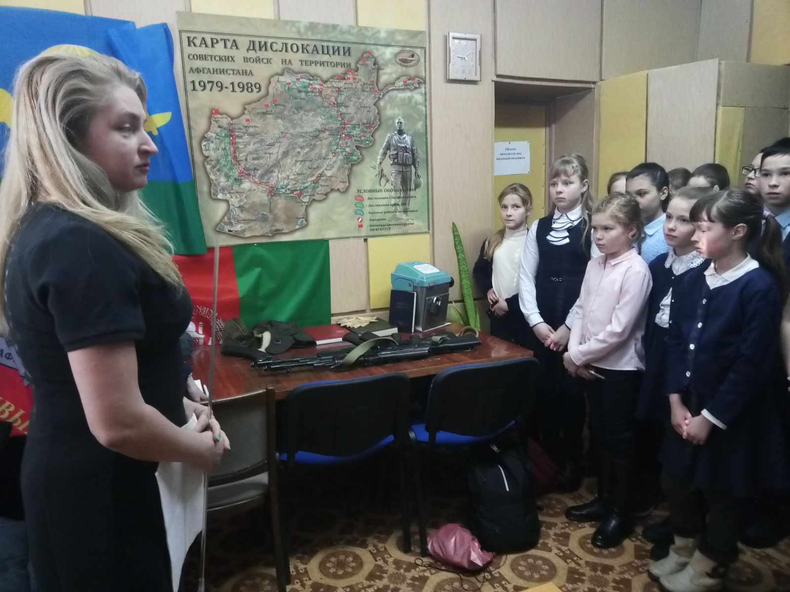 Ребята внимательно слушали экскурсовода Ю.Кофтун, которая рассказала им о том, как начиналась и сколько длилась страшная война в Афганистане, какую дорогу пришлось пройти нашим солдатам. Она напомнила, как важно знать и помнить историю своей страны и ее героев. В завершении экскурсии ребята почтили минутой молчания тех, кто погиб в локальных войнах.