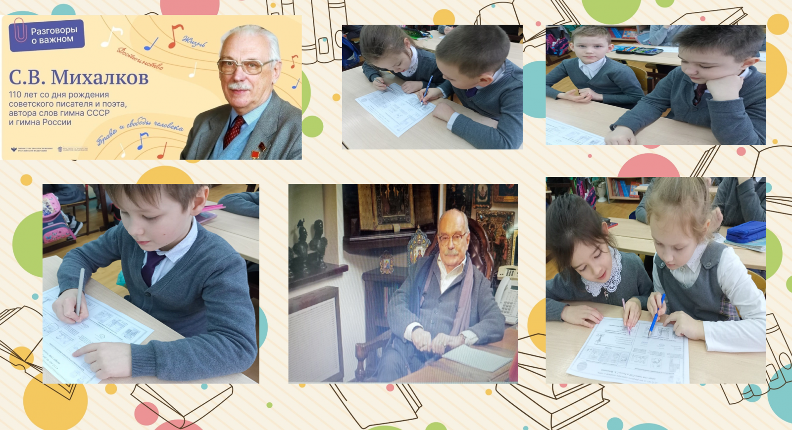 На внеурочных занятиях "Разговоры о важном" говорили на тему «110 ЛЕТ СО ДНЯ РОЖДЕНИЯ СОВЕТСКОГО ПИСАТЕЛЯ И ПОЭТА, АВТОРА СЛОВ ГИМНА СССР И ГИМНА РОССИИ С. В. МИХАЛКОВА».