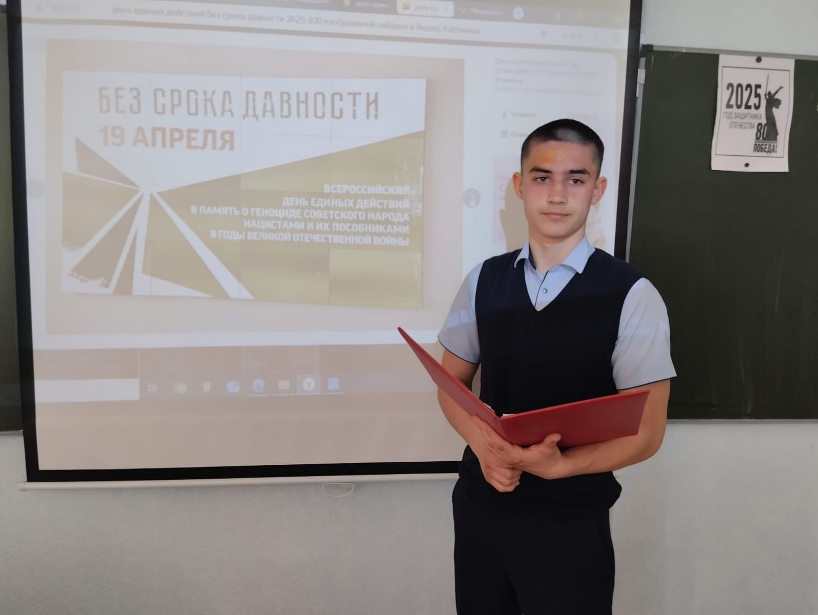 В рамках проведения 19 апреля Дня Единых Действий силами учащихся 9 класса были проведения ряд мероприятий направленные на изучение исторических источников по темам проявлений геноцида советского народа, совершённого нацистами в годы Великой Отечественной войны 1941‒1945 гг.