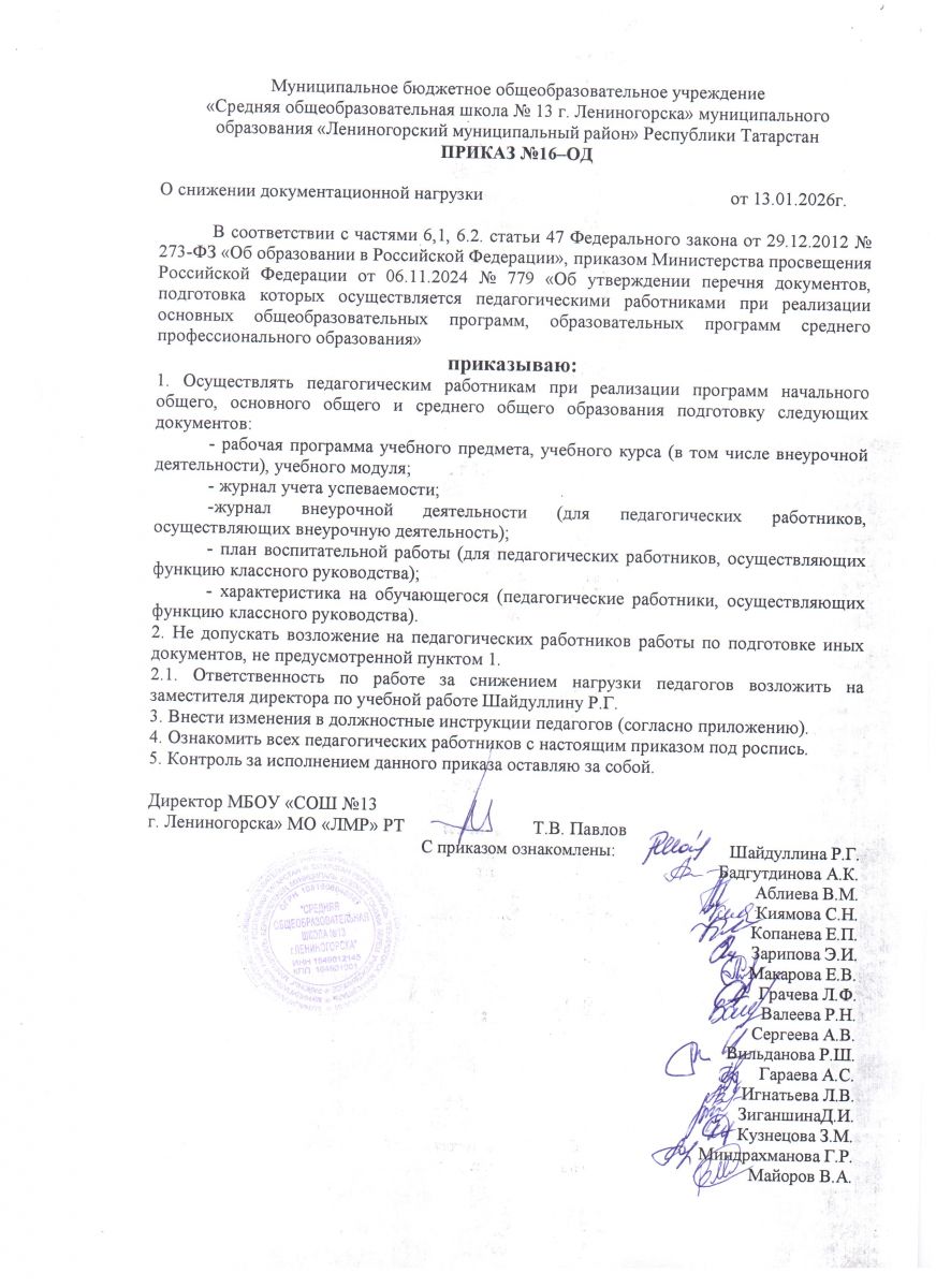 Приказ "О снижении документационной нагрузки" №16-ОД от 13.01.2026 г.