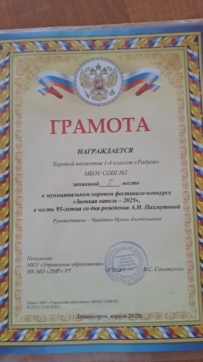 Опубликовано: 14.04.2025Поздравляем хоровой коллектив нашей школы «Радуга», занявший 1 место в муниципальном конкурсе «Звонкая капель», в честь 95-летия со дня рождения А.Н. Пахмутовой. Молодцы!