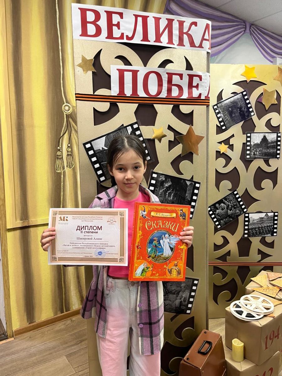 Очень радостно, что читатели нашей библиотеки оказались победителями в следующих номинациях: «Герой моего сердца» (7-9 лет) Шакирова Алина, МБОУ «СОШ Nº2» - 2 место, «Книжные приключения» (10-14 лет) Галимова Азалия, МБОУ«СОШNº2» - 3 место. Багауовы Айдина, Данияр, Зарина,