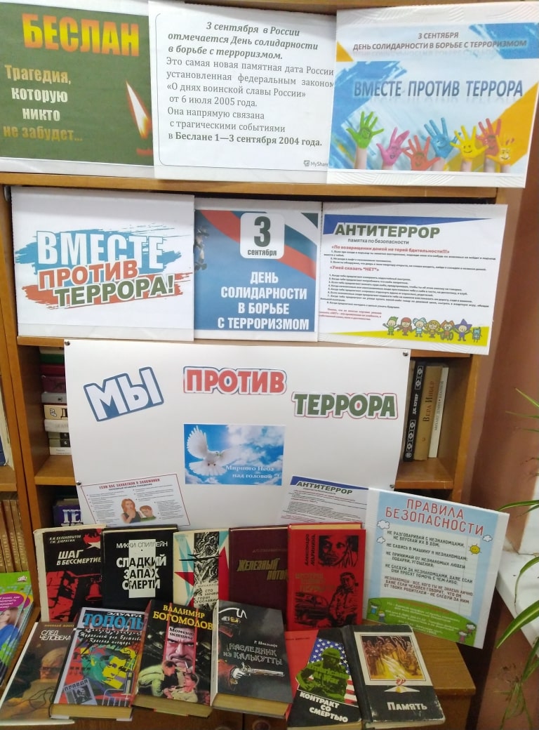 Тематическая книжно-иллюстрированная выставка на тему: "Борьба с терроризмом касается каждого!" 02.09.2021Терроризм – это одна из самых опасных и масштабных угроз человеческой жизни.3 сентября – День солидарности борьбы с терроризмом, день траура по всем жертвам терактов, а также по людям, которые погибли, выполняя свой долг в ходе спасательных операций. Россияне вспоминают всех погибших в ходе террористических актов: в Буденновске, Беслане, Первомайском, Волгограде и других городах.Каждый год 3 сентября ровно в 13:05 в мемориальном комплексе Беслана после удара колокола в небо взлетает 335 белых шаров, которые символизируют души погибших там людей. Вечером перед разрушенным зданием школы зажигают свечи, которые горят до утра.Школьный библиотекарь Андреева Л. М.. подготовила выставку книг, посвященную Дню солидарности в борьбе с терроризмом.На выставке представлены книги с 1997 по 2020 гг.: о проблемах терроризма, истории его возникновения, современных проблемах, антитеррористической деятельности, наиболее известных террористических актах, правовых аспектах и уголовной ответственности.