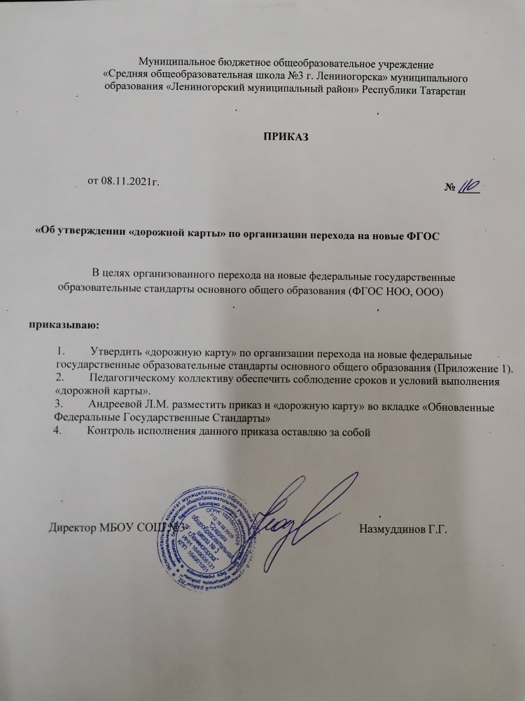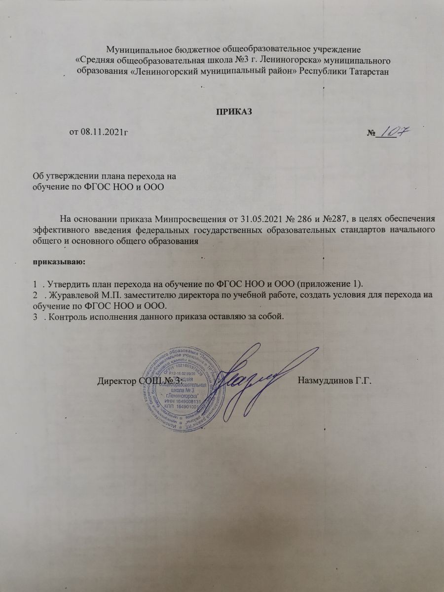 Приказ МБОУ "СОШ №3" об утверждении плана перехода на обучение по ФГОС НОО и ООО
