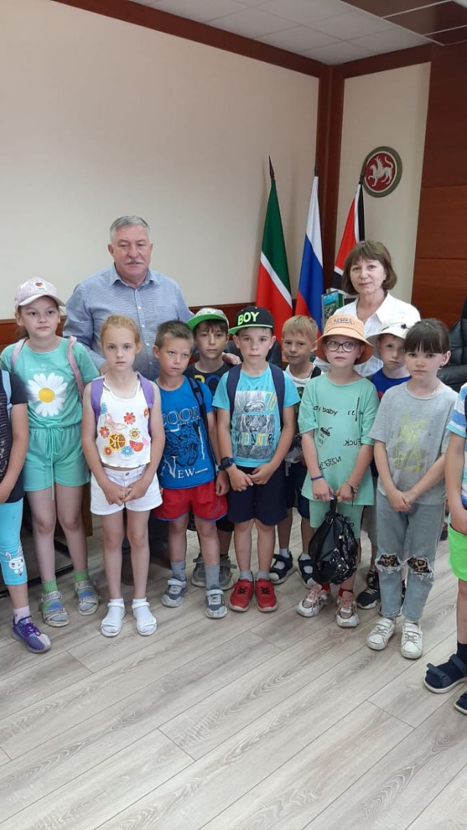 Сегодня состоялась встреча детей пришкольного лагеря с мэром Хусаиновым Р.Г. Встреча прошла в здании администрации. Рафикова Г. М. , заместитель мэра провела с детьми экскурсию. Ребята узнали где и как рождаются законы.