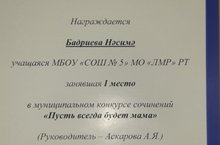 Мәдәният йортында “Һәрвакыт булсын әни!” дип исемләнгән муниципаль конкурс үткәрелде. 8Б сыйныфы укучысы Бадриева Нәсимә сочинение номинациясендә 1 урынны яулады. Котлыйбыз!!! Укытучысы Аскарова Ә.Я.