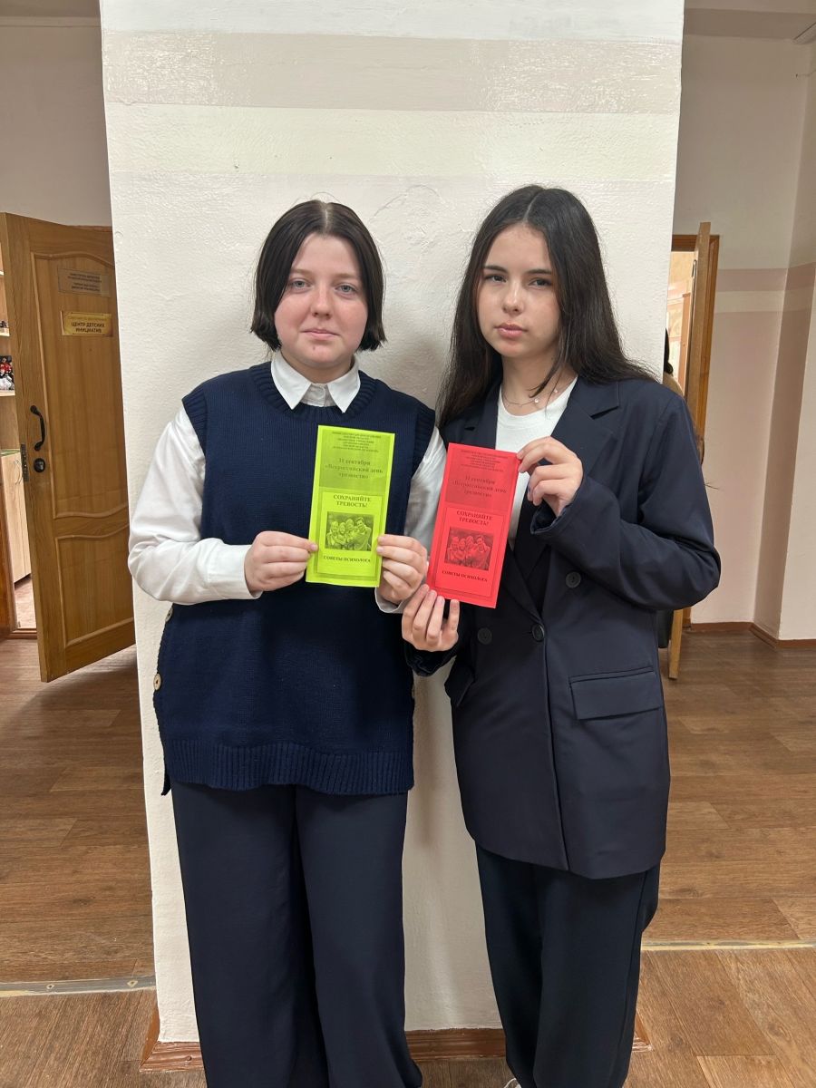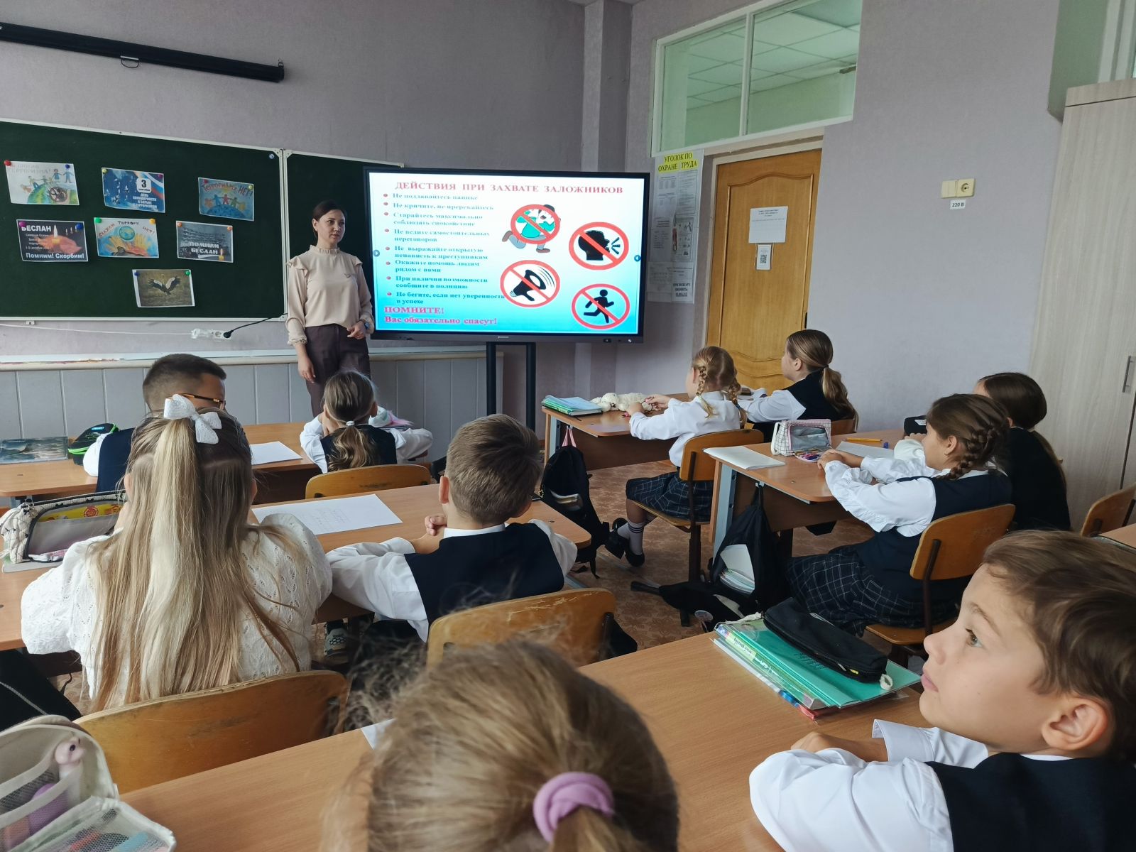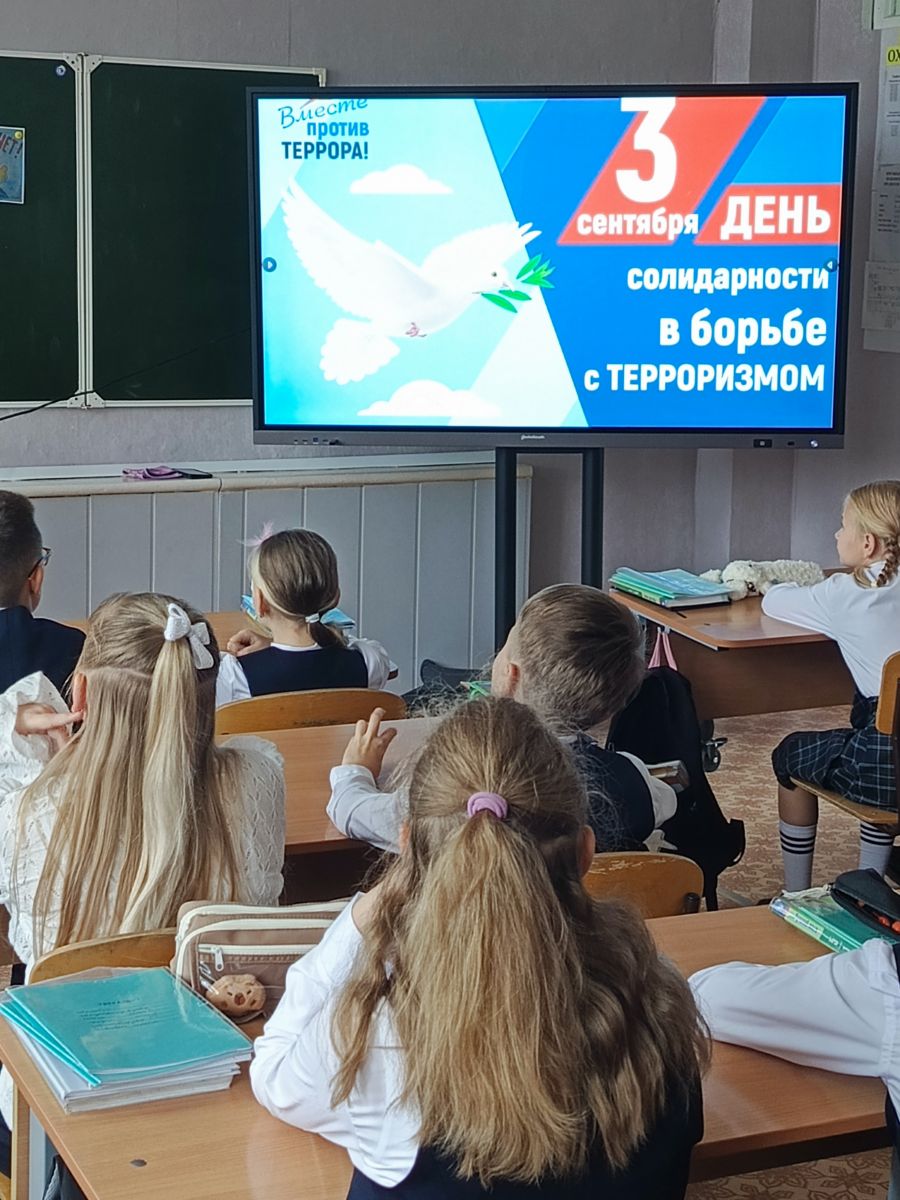 Сегодня наша школа провела тематические классные часы в честь памяти погибшим. Советник директора по воспитанию совместно с детской городской библиотекой провели мероприятие, на котором показали презентацию, видеоролик о страшном дне, ребята зачитали стихи, разгадывали сканворды, в заключении ученикам были розданы тематические раскраски.