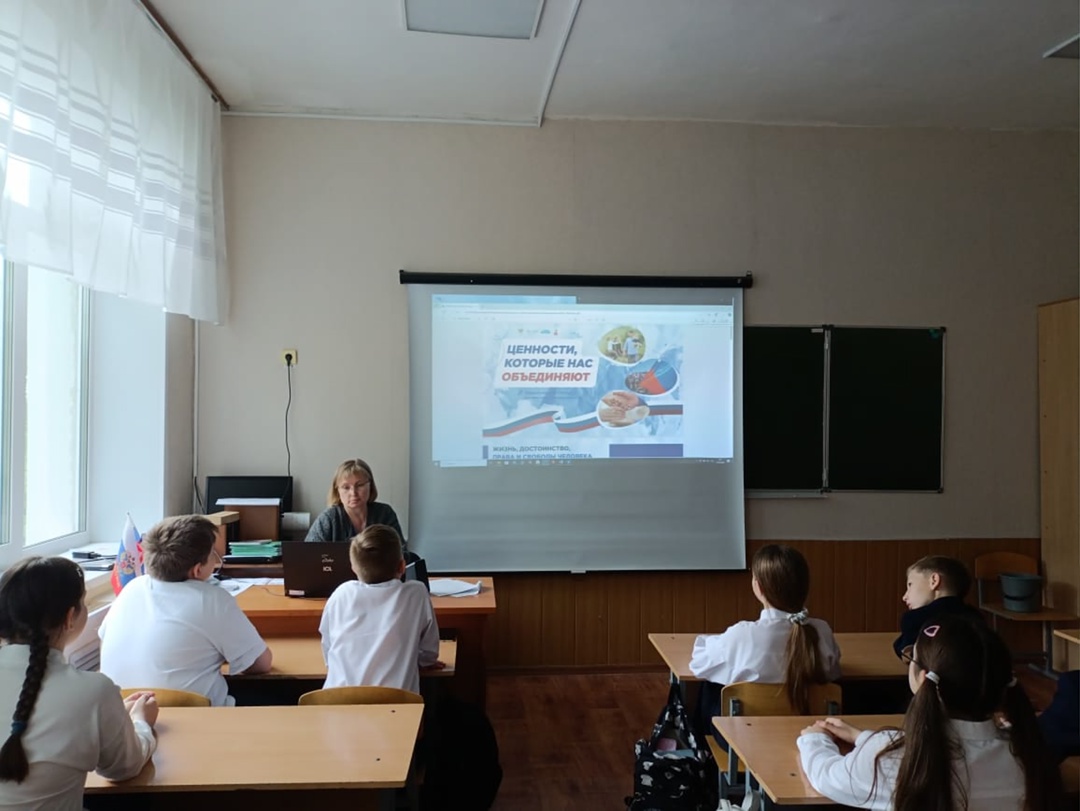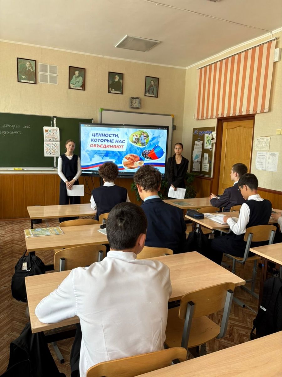 «Ценности, которые нас объединяют» посвящен традиционным ценностям как важному элементу повседневной и общественной жизни. С учащимися поговорили о том, для чего человеку нужны духовно-нравственные ориентиры, а также о том, как общие ценности помогают многонациональному народу России оставаться единым. -