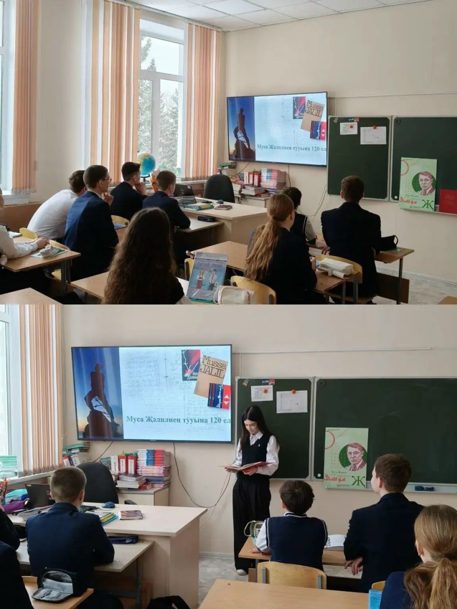 15 нче февраль - патриот шагыйрь , журналист Муса Җәлилнең туган көне. Муса Җәлилнең әдәби мирасын пропагандалау һәм патриотик тәрбия бирү максатыннан мәктәбебездә 9 сыйныф укучылары белән әдәби чара үткәрелде. Укучылар шагыйрьнең тормыш һәм иҗат юлы белән таныштылар,кызыклы фактлар белделәр, татар һәм рус телләрендә шагыйрьнең шигырьләрен сөйләделәр, викторина сорауларына җавап бирделәр.Муса Җәлилнең китаплары белән таныштылар.
