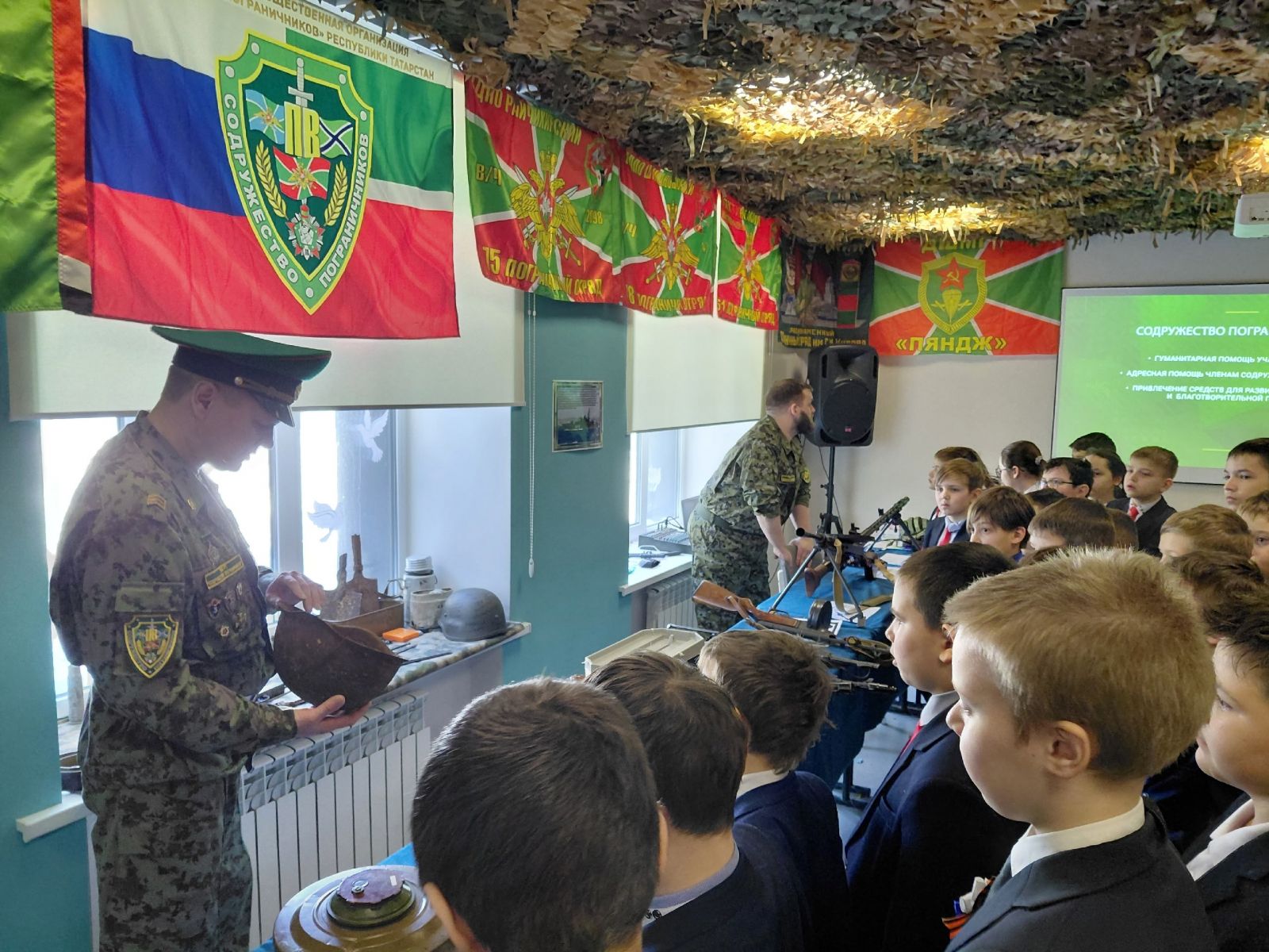 В рамках месячника оборонно-массовой работы и военно-патриотического воспитания, посвященного дню Защитника Отечества 4 А и 4 В классы посетили мобильный музей-выставку "НА ЗАЩИТЕ ГРАНИЦ"