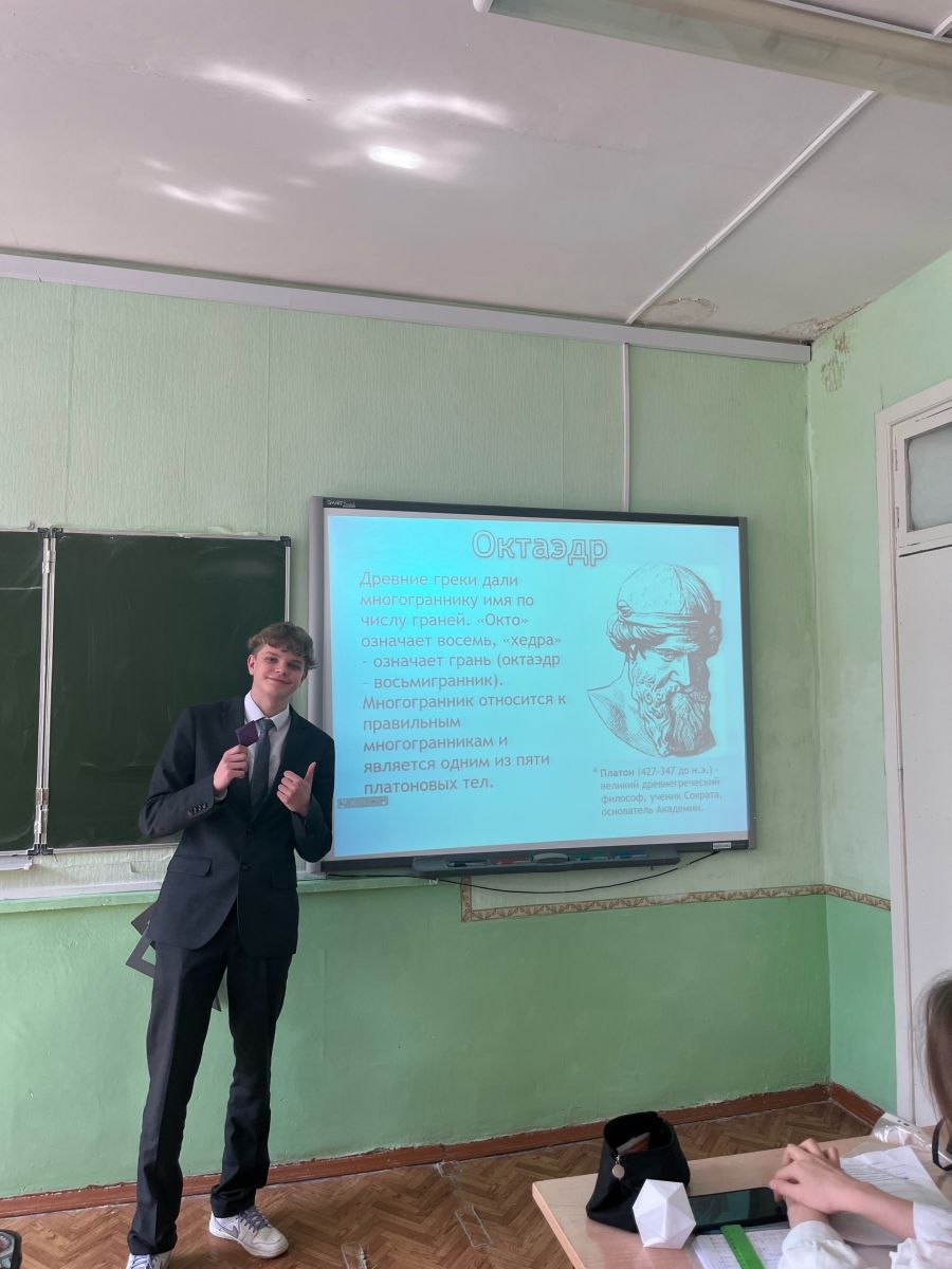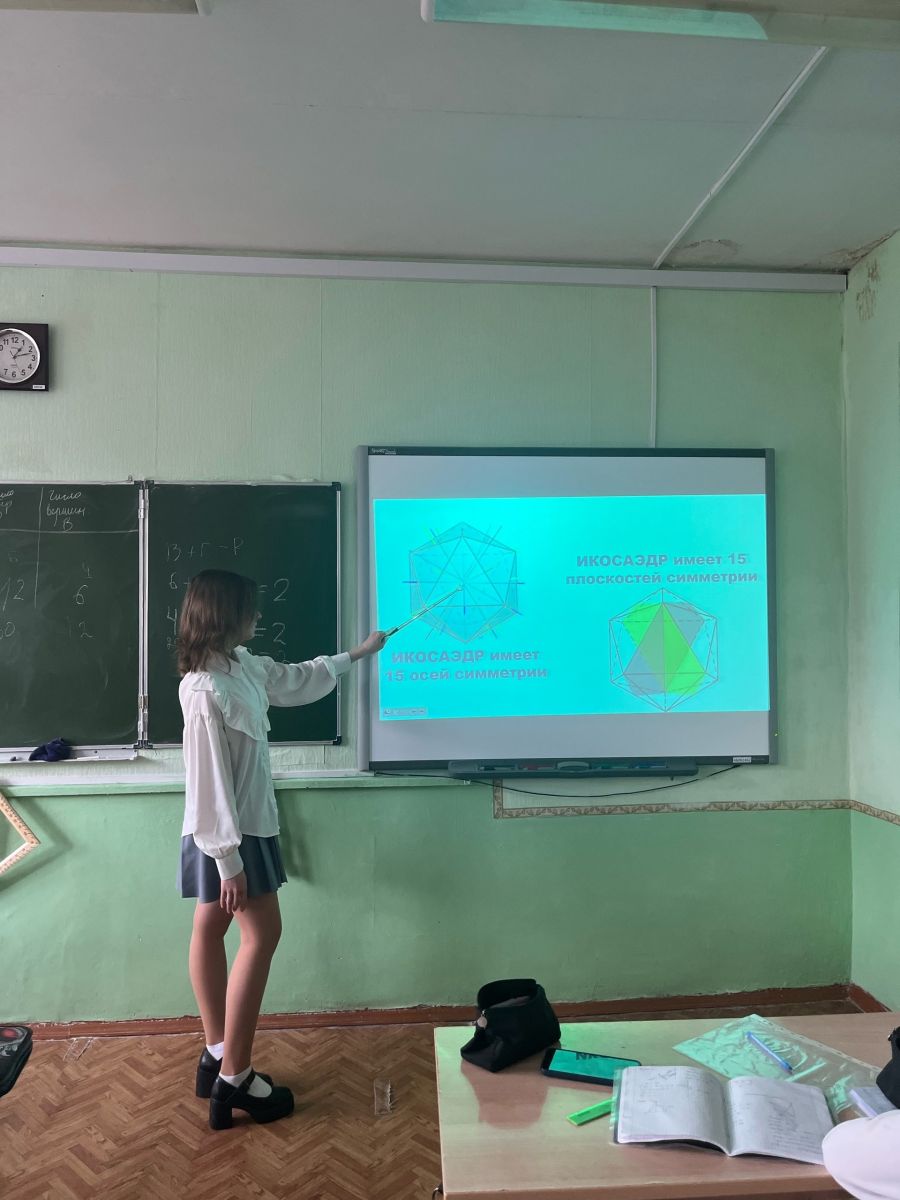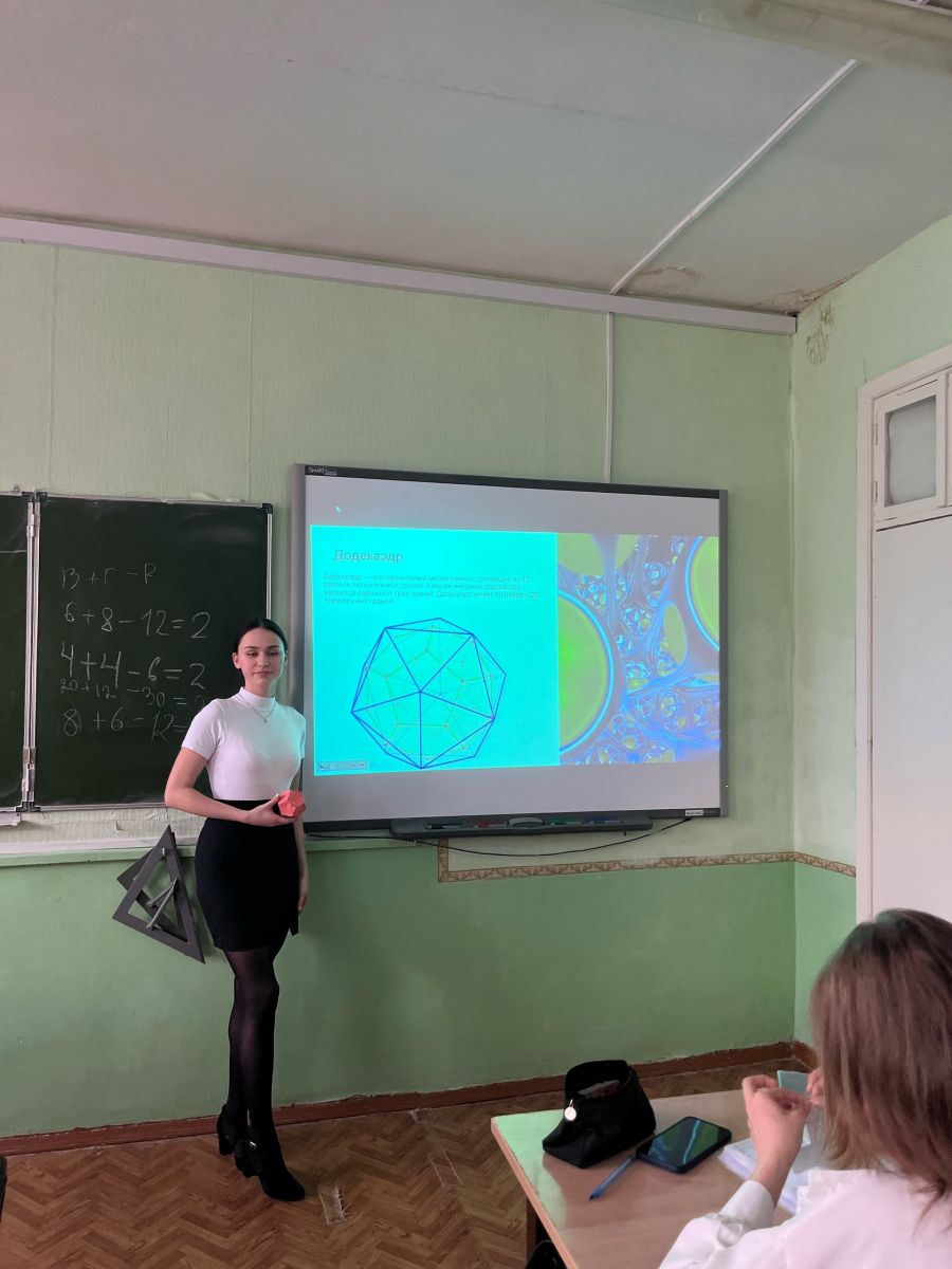 В рамках недели математики 9 апреля 11 класс отправился на математическую экскурсию в мир симметрии. Уникальные тела Платона. Экскурсию подготовили и провели Алексеев Максим, Гиниятуллина Ралина, Больших Катя, Мошникова Аделина, Федина Лиза. Входе экскурсии ученики презентовали продукты своих проектов по правильным многогранникам. Экскурсоводам задавались вопросы. Экскурсия получилась познавательной!