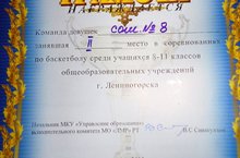 Поздравляем команду девушек ( 8 А - Соколова Анастасия, 10 А - Фадеева Екатерина, Гайфуллина Диана, Манакова ольга, Зиновьева Анастасия, Ломбакшева Ангелина) занявшую 2 место в соревнованиях по баскетболу среди учащихся 8 - 11 классов общеобразовательных учреждений города Лениногорска. Молодцы!