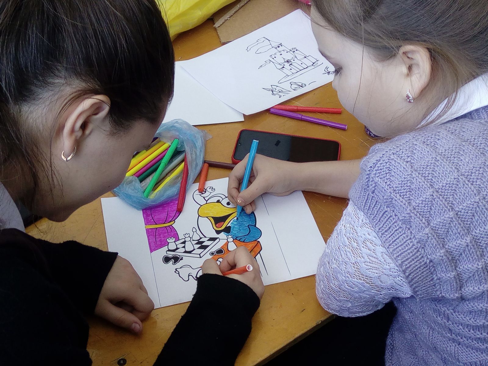 Участники кружка “Проектирование в социальной среде” за работой над проектом “ Эти занимательные пазлы”. В своих работах участники кружка отображают тематику шахмат.