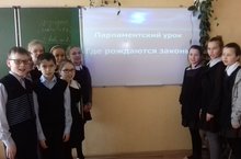 Парламентский урок «Где рождаются законы» прошел в 5-х классах (учитель Кириллова Л. А.). На уроке учащиеся изучили структуру законодательной власти РФ. Ответили на вопросы о главном документе страны – Конституции РФ. Определили права ребенка, о которых упоминается в детских песнях.