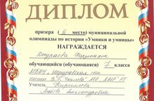 На состоявшейся 10 апреля ежегодной муниципальной олимпиаде по истории «Умники и умницы» , ученица 7 а класса Джураева Ф. (учитель Кириллова Л. А) стала призером (3 место), продемонстрировав хорошие знания по истории России XVII века. Поздравляем и желаем удачи!
