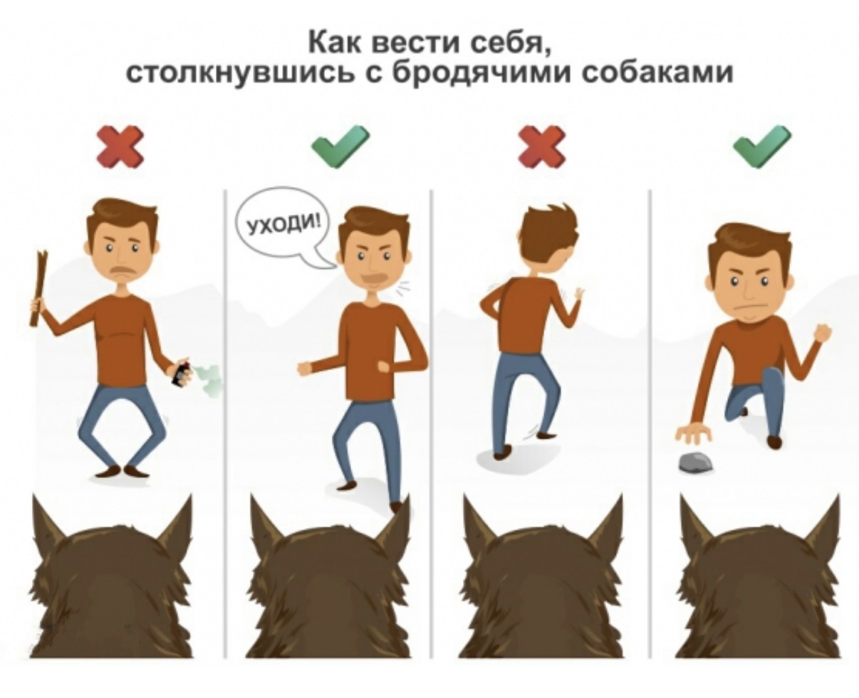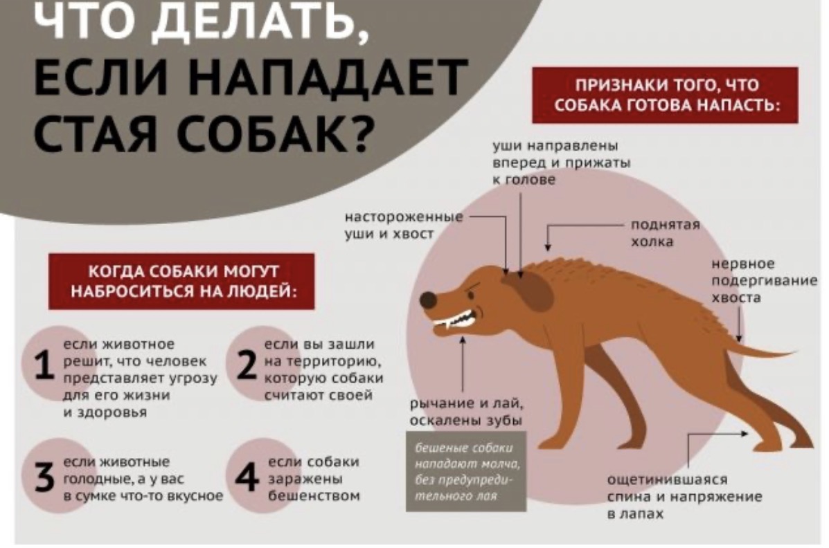 Если укус кажется неизбежным, используйте всё, что есть под рукой, чтобы защитить себя. Уязвимые места у собак — кончик носа, переносица, основание черепа, середина спины, живот.