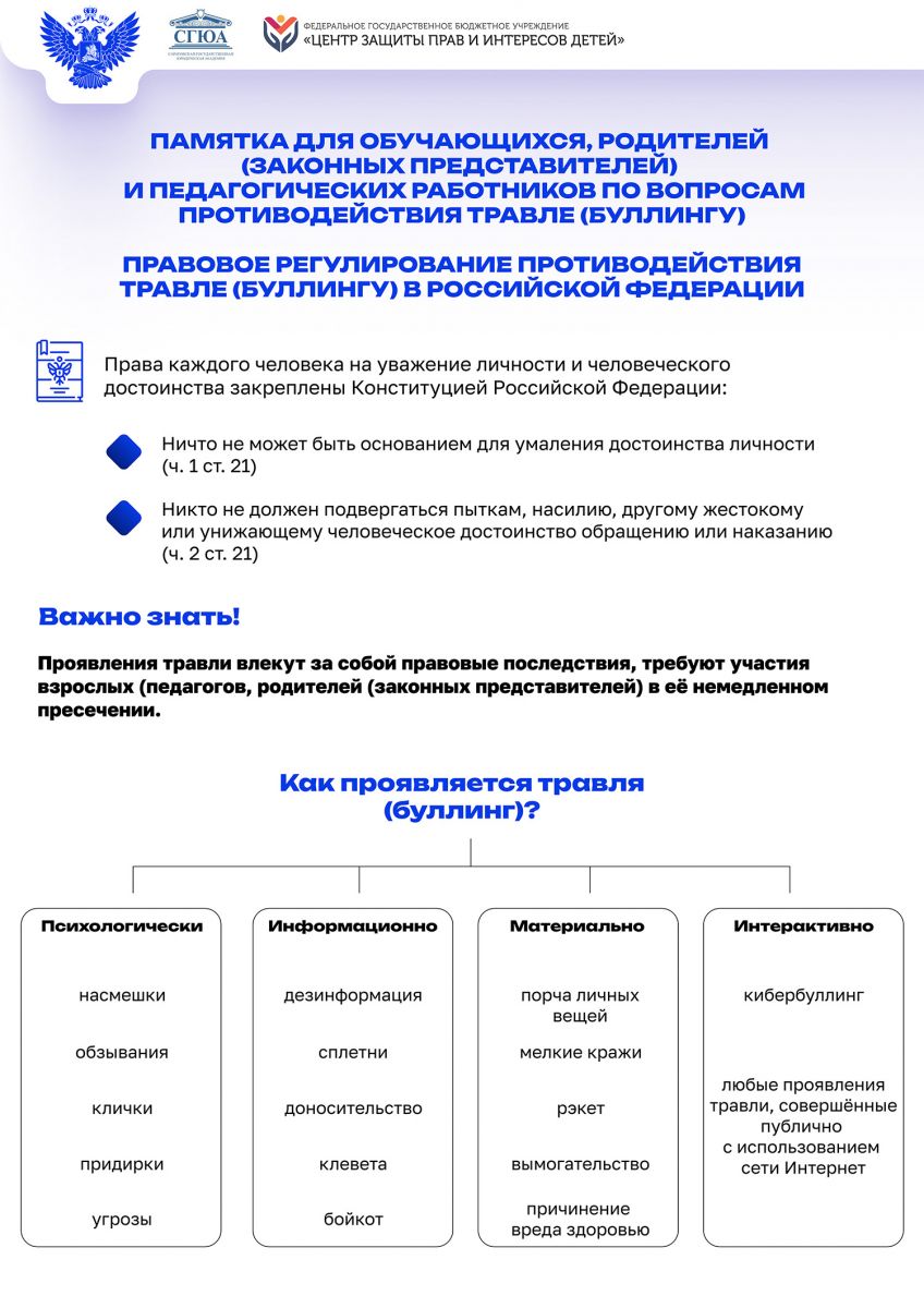 ПАМЯТКА ДЛЯ ОБУЧАЮЩИХСЯ, РОДИТЕЛЕЙ (ЗАКОННЫХ ПРЕДСТАВИТЕЛЕЙ) И ПЕДАГОГИЧЕСКИХ РАБОТНИКОВ ПО ВОПРОСАМ ПРОТИВОДЕЙСТВИЯ ТРАВЛЕ (БУЛЛИНГУ) ПРАВОВОЕ РЕГУЛИРОВАНИЕ ПРОТИВОДЕЙСТВИЯ ТРАВЛЕ (БУЛЛИНГУ) В РОССИЙСКОЙ ФЕДЕРАЦИИ