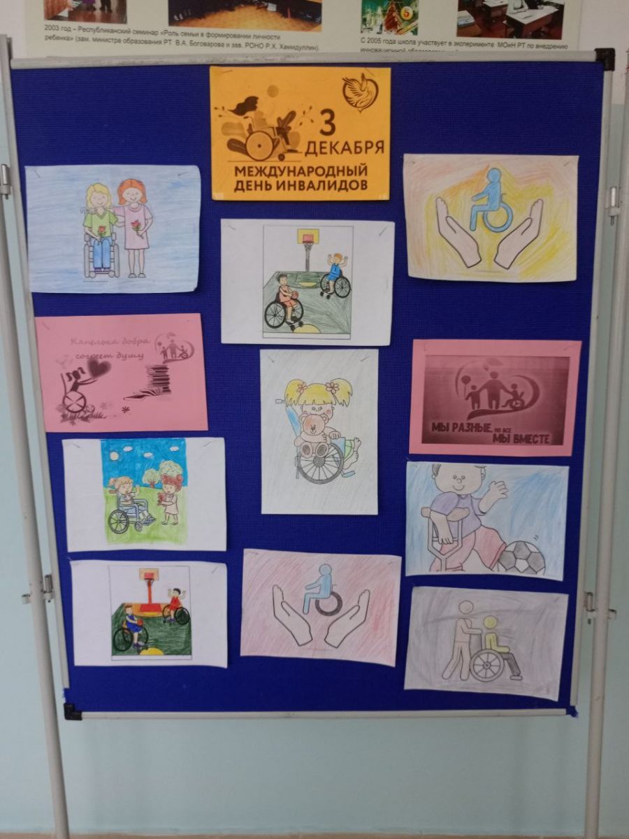 Советником по воспитанию был организован и проведен тренинговое занятие "Толерантное отношение к людям с ограниченными возможностями". Учащиеся 7 класса на собственном опыте смогли почувствовать,что значит жить в ограничениях и нарисовали рисунки для выставки.