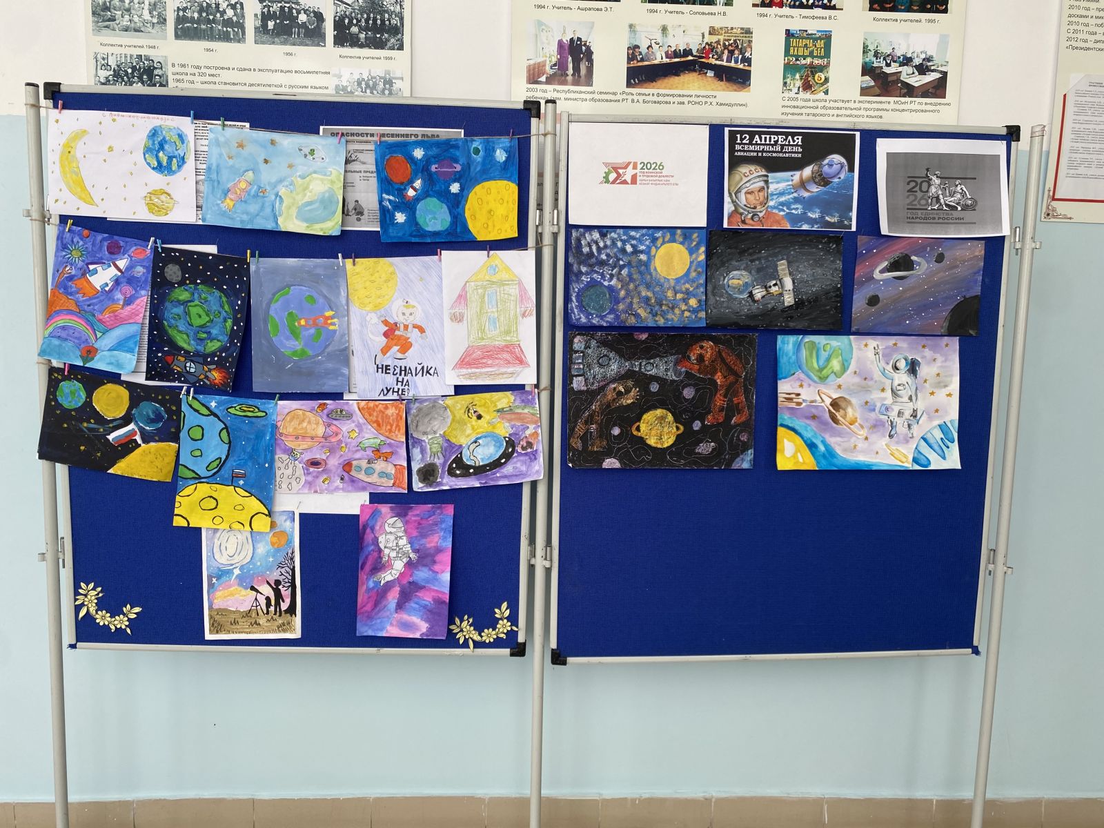 Совместно с учащимися оформили выставку рисунков, посвящённый Дню космонавтики, где разместили яркие рисунки с изображением планет и звёзд. Получилась настоящая мини-выставка, которая радует учеников и напоминает о захватывающем путешествии в мир космоса.