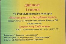 VI Республика "Народы разные- Республика одна" конкурсының "Один кадр- одна история" номинациясендә фотосүрәтләр сериясе белән I дәрәҗә дипломга лаек булды.