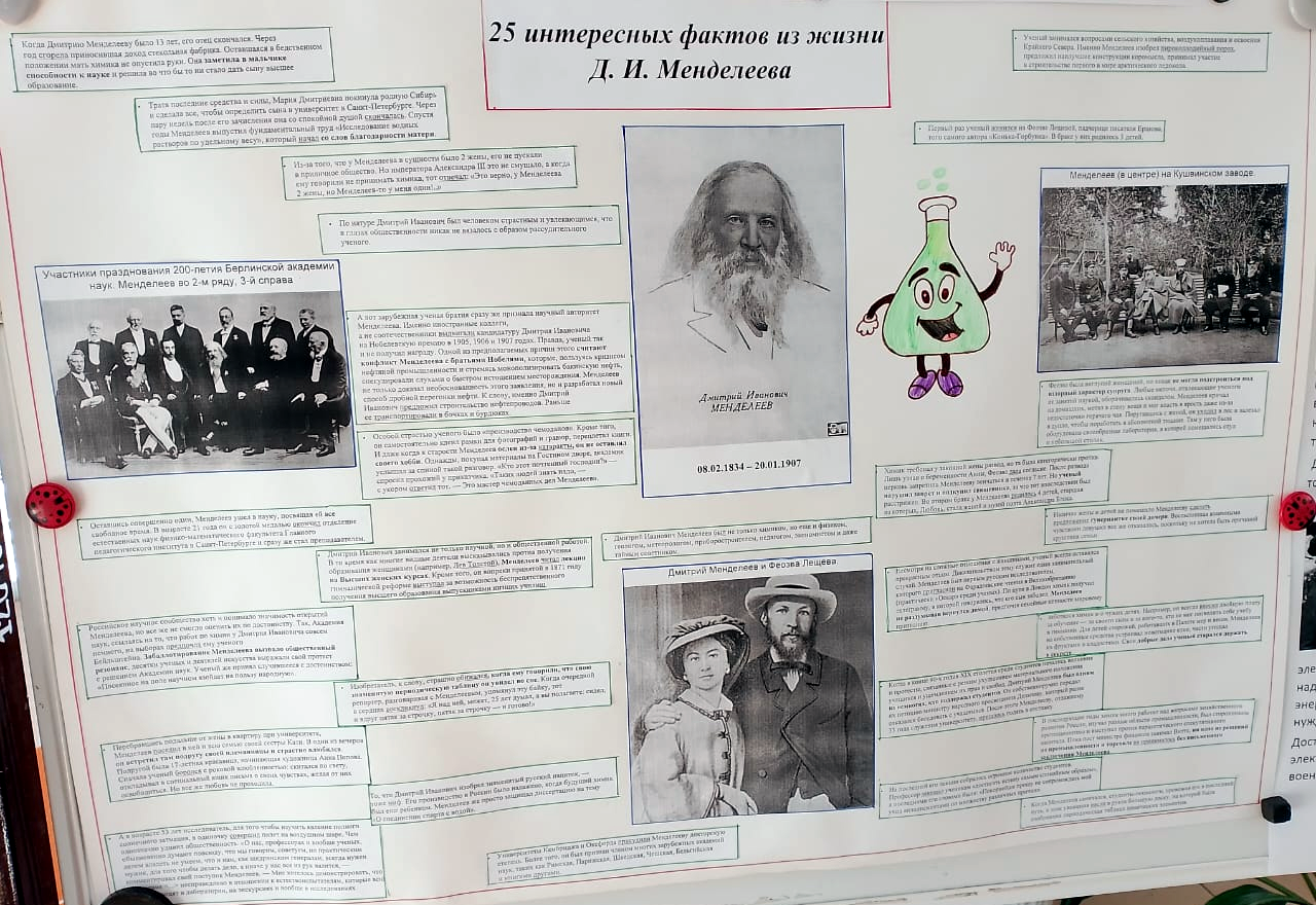 17.02.2025 года по программе недели "Химия в школе" была выпущена стенгазета "25 интересных фактов из жизни Менделеева."