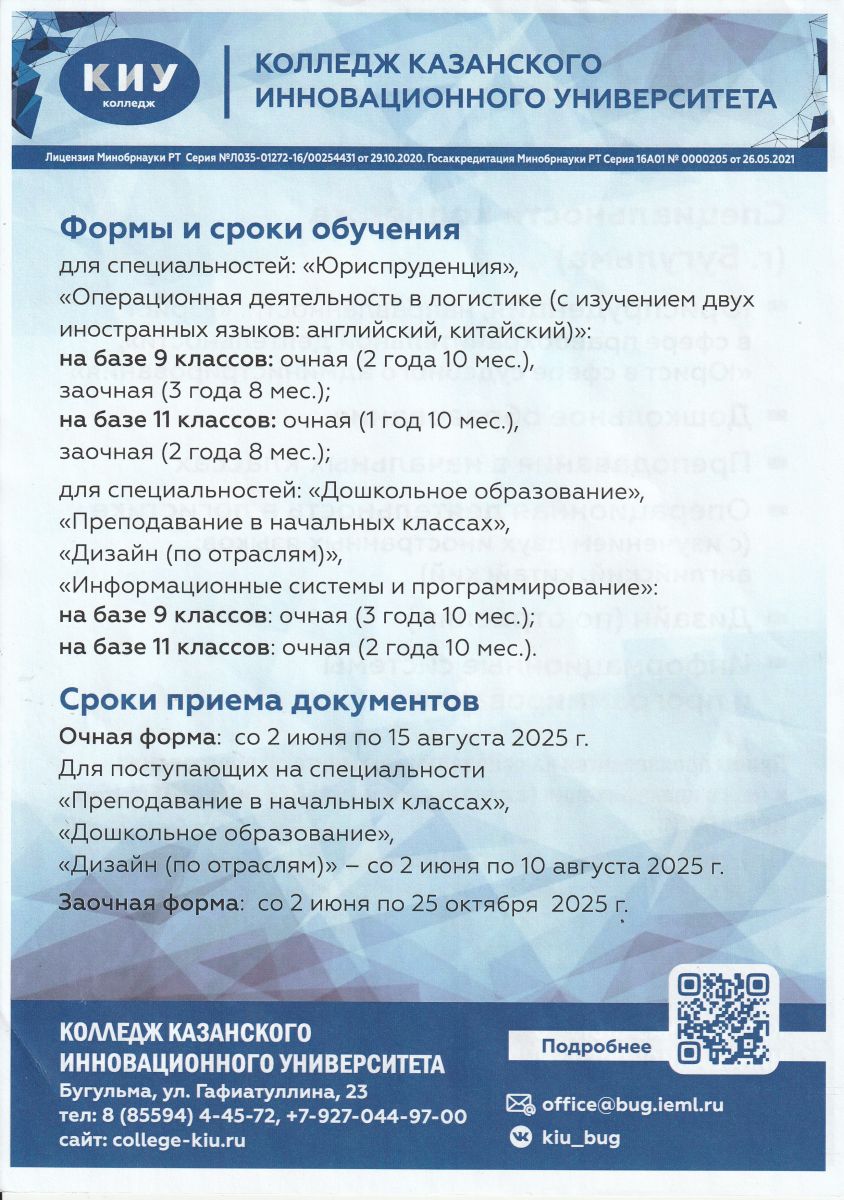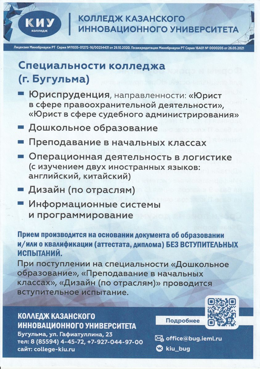 Опубликовано: 21.02.2025Сегодня в рамках профориентационной работы прошла встреча обучающихся 9-11-х классов с представителями КИУ г Бугульма ( колледжа Казанского инновационного университета). Представители КИУ подробно рассказали нашим выпускникам о деятельности колледжа, познакомили с условиями поступления, рассказали о мероприятиях, которые позволяют будущим студентам иметь дополнительные баллы к ЕГЭ, о бюджетных и коммерческих местах, а также о мерах поддержки студентов, социальных гарантиях. В ходе беседы ребята получили ответы на волнующие их вопросы, получился очень конструктивный диалог. Мероприятие было интересным и полезным, ведь старшеклассники уже сейчас понимают, что одним из главных приоритетов в жизни является правильный осознанный выбор будущей профессии.