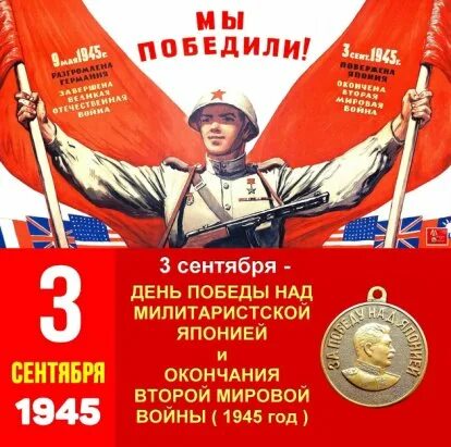Опубликовано: 03.09.2025День воинской славы России – 3 сентября 1945 года – День Победы над милитаристской Японией и окончания Второй мировой войны (1945 год). В этот день был подписан акт о безусловной капитуляции Японии, что положило конец Второй мировой войне. 3 сентября 1945 года советская пресса опубликовала обращение Сталина И.В. к народу. Там говорилось об окончании войны с Японией.