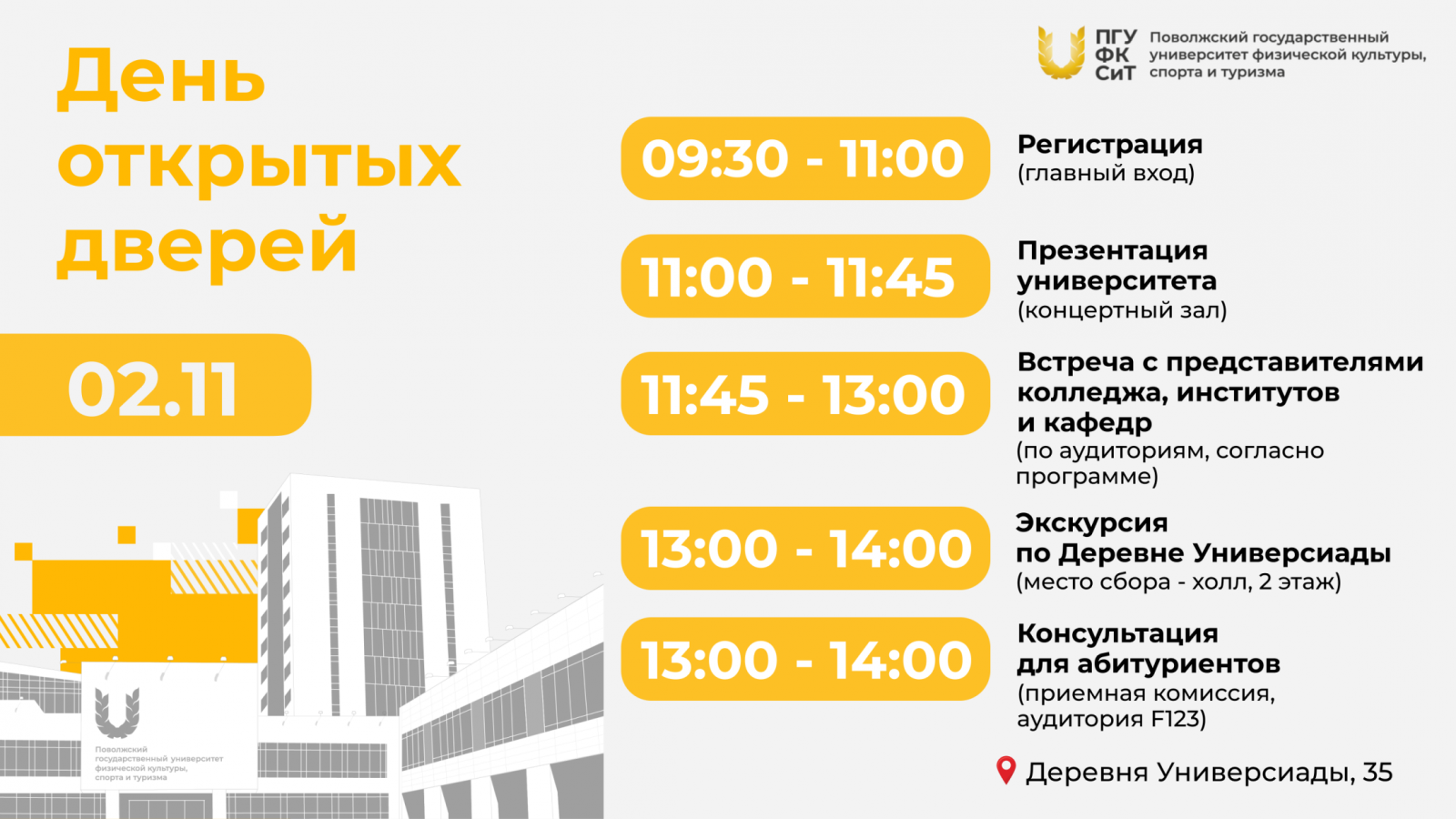 Сообщаем, что 2 ноября 2025 года в 11:00 часов Университет проводит День открытых дверей. Мероприятие пройдет в Учебно-лабораторном корпусе по адресу: г. Казань, тер. Деревня Универсиады, зд. 35. В программе мероприятия: презентация Университета, встреча с представителями институтов, кафедр и приемной комиссии, экскурсия в студенческое общежитие. Онлайн трансляция мероприятия по ссылке https://vk.com/abiturient_unifirst?from=groups .