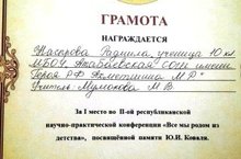 26 марта состоялась IIреспубликанская научно-практическая конференция "Все мы родом из детства", посвященная памяти Ю.И.Коваля. Свои исследовательские работы представляли Халиуллина Разиля(6 класс) и Насырова Радмила(10 класс). Девочки выступили достойно, а Радмила заняла 1 место в своей секции. Поздравляем!