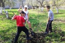 Продолжается двухмесячник по благоустройству территорий. Сегодня ученики сажали деревья на пришкольном участке, обновляя плодовый сад.