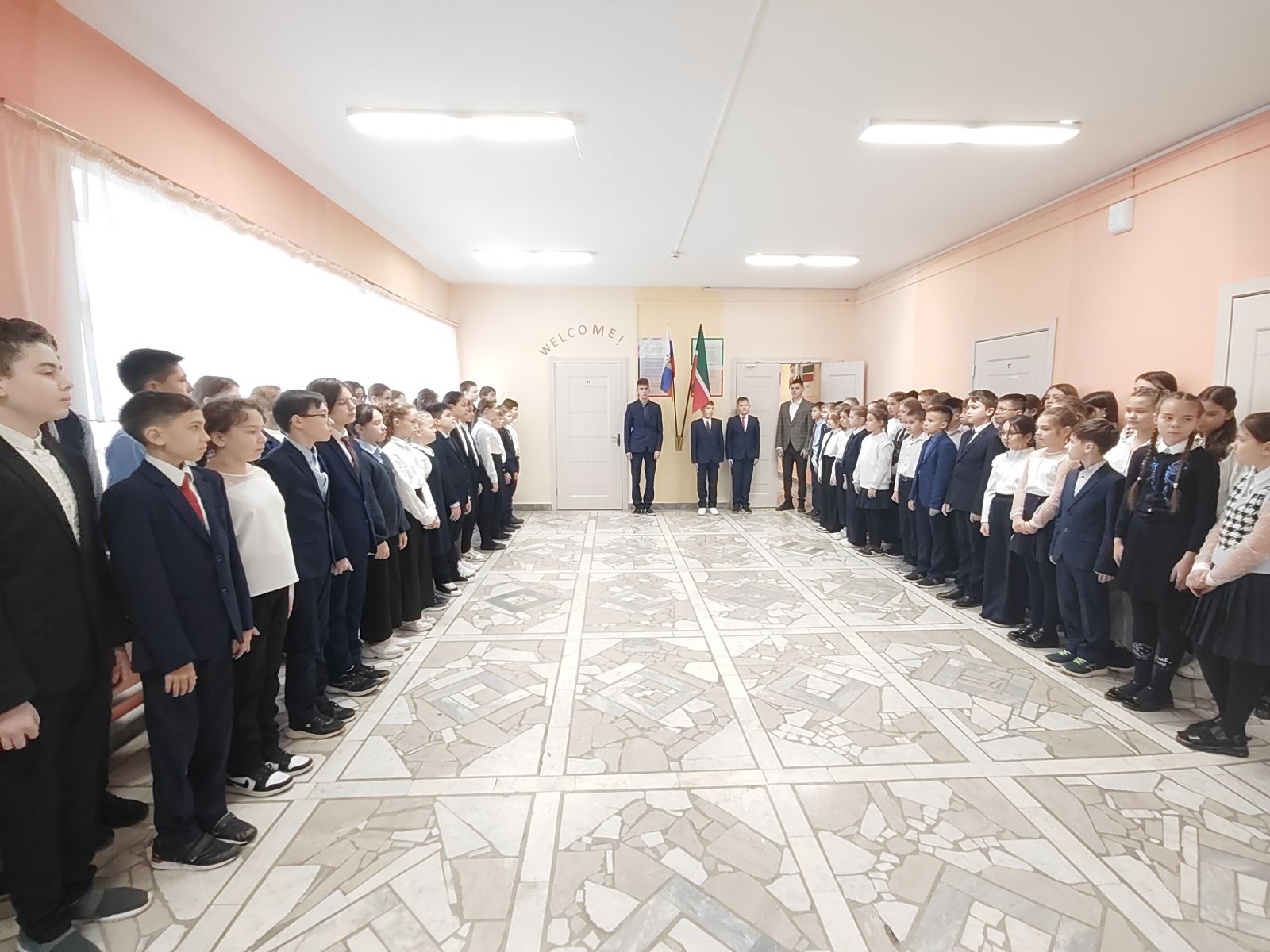 Опубликовано: 28.11.2022Традиционно линейка началась с торжественного выноса государственных флагов и исполнения гимна Российской Федерации и Республики Татарстан. Сегодня, 28 ноября 2022 года, это почетное право было предоставлено учащимся проявившим успехи в учёбе и спорте: Нуруллину Данису и Захарову Артуру, ученикам 6 А класса.