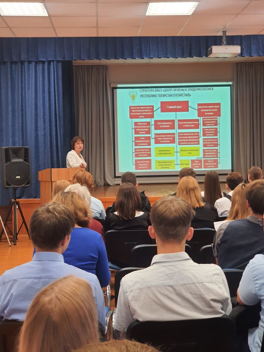 Опубликовано: 24.10.202424 октября в рамках профориентационной деятельности прошла встреча учащихся 9-11-х классов с Ольгой Викторовной Довбыш, санитарным врачом общей гигиены отдела Лаишевского района ФБУЗ «Центр гигиены и эпидемиологии в Республике Татарстан».