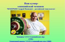 В МБОУ " Именьковская СОШ" организован просмотр видеофильма "Наш кумир- олимпийский чемпион ЧЕМЕРКИН Андрей Иванович"ЧЕМЕРКИН Андрей Иванович – российский тяжелоатлет Чемпион XXVI Олимпийских игр (1996) Бронзовый призер XХVII Олимпийских игр (2000) Четырехкратный чемпион мира (1995, 1997-1999)О нашем кумире вся информация на его официальном сайте! http://www.chemerkin.ru/