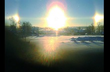 СРАЗУ 3 СОЛНЦА !!! 20.01.2014 Редкое оптическое явление - гало на алмазной пыли – наблюдали сегодня утром наши ученики над Каипами. Сразу 3 солнца и 3 радуги одновременно ! Отражение Солнца в мельчайших ледяных кристаллах создало на рассвете подобие зимней радуги. Это было подобно чуду!