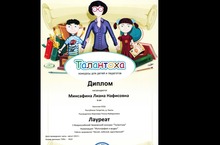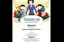 ДИПЛОМОМ лауреата II Всероссийского творческого конкурса награждена МАМЛЕЕВА Р.М. за подготовку учеников 3 класса КУЗНЕЦОВА РОМАНА и МИНСАФИНОЙ ЛИАНЫ лауреатов II Всероссийского творческого конкурса «ТАЛАНТОХА» в номинации «Фотография и видео» за работу : видеоролик «МИЛОЙ, ЛЮБИМОЙ, ЕДИНСТВЕННОЙ…», который ребята посвятили своим мамам.