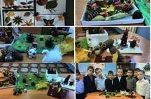 Ученики 1 класса сделали аппликации из листьев и поделки из шишек. -