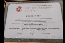 Лаишевская специальная (коррекционная) школа-интернат награждена Благодарственным письмом Министерства Образования и Науки Республики Татарстан за большой вклад в проведении работ по строительству и благоустройству футбольного стадиона «KAZAN-ARENA».