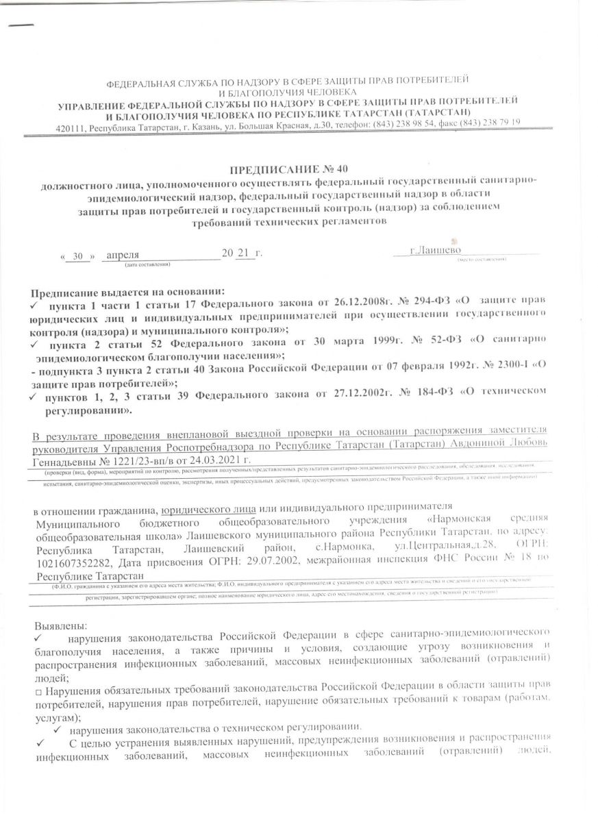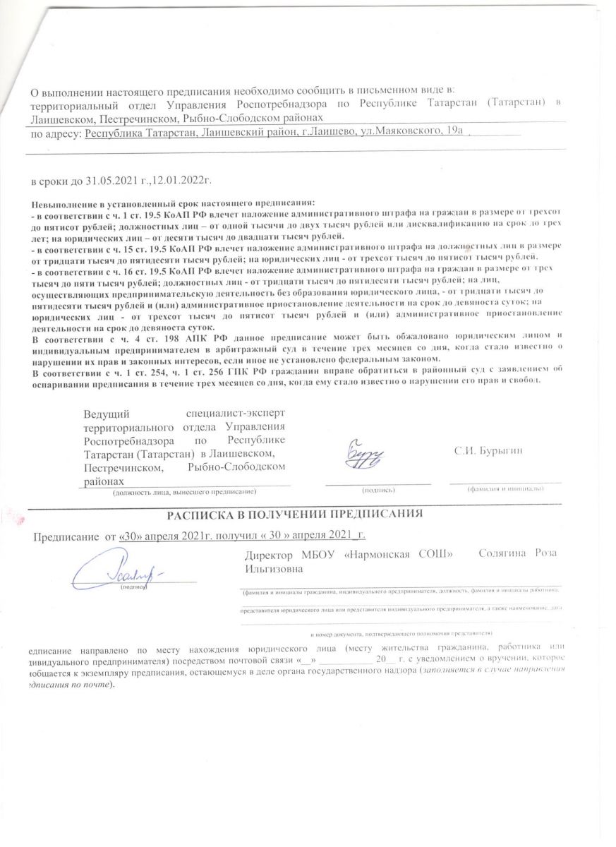 Предписание Роспотребнадзора от 30 апреля 2021 года 1 стр2 стр.,  3 стр
