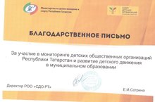 Министерство по делам молодежи и спорту Республики Татарстан совместно с Региональной общественной организацией «Совет детских организаций Республики Татарстан» (далее – СДО РТ) проводило мониторинг детских общественных организаций Республики Татарстан. Детская организация нашей школы прошла мониторинг и получила благодарственное письмо