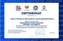 Федеральный институт родных языков народов Российской Федерации выражает благодарность за активное участие во Всероссийском сетевом флешмобе «Мой язык-моя гордость», который проводился с 2 по 20 февраля в рамках программы празднования Международного дня родного языка в 2026 году. Руководитель учитель русского языка и литературы Макарова Светлана Семеновна